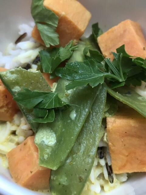 Süßkartoffelcurry mit knackigen Zuckerschoten